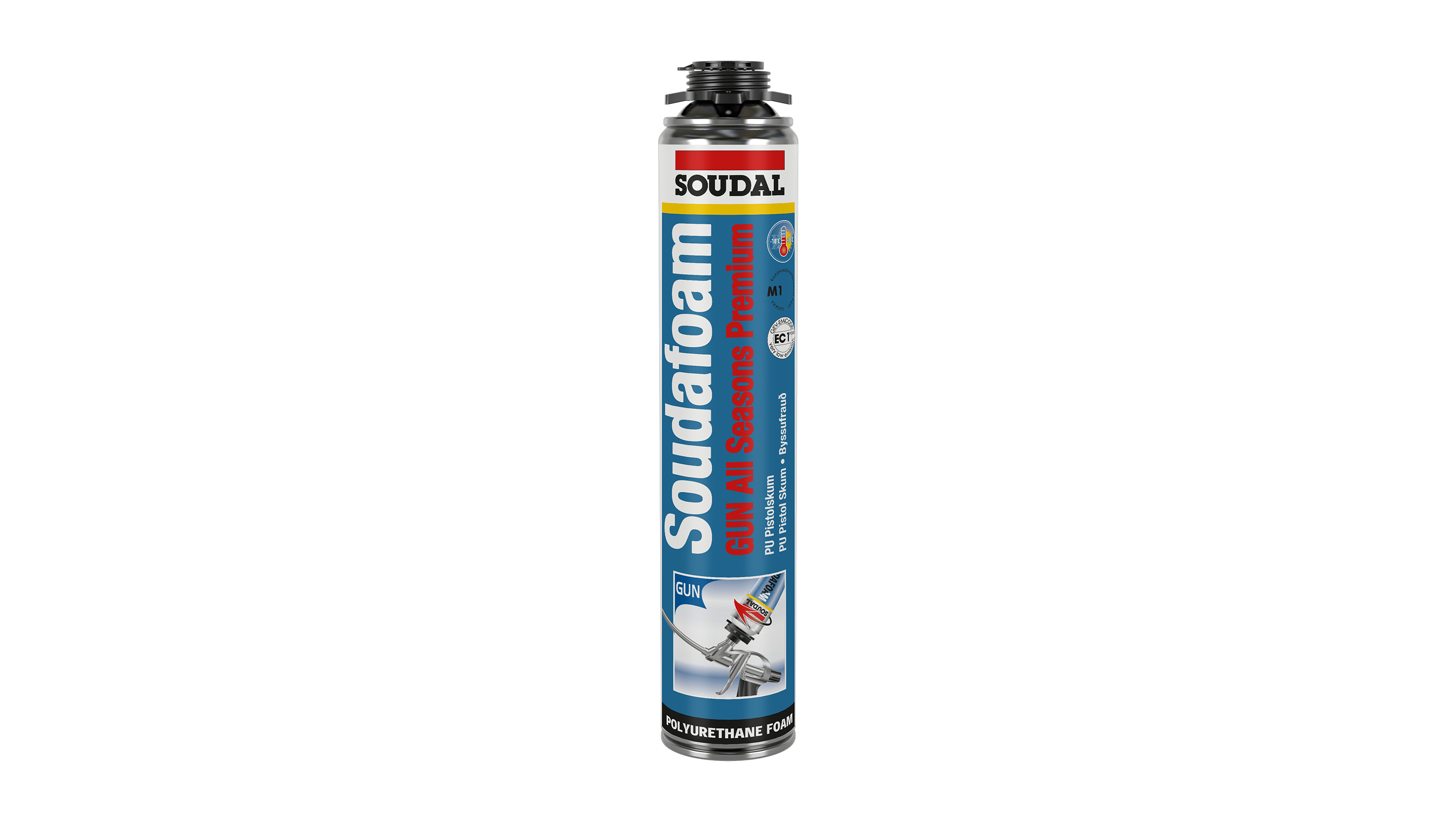 Soudafoam Gun All Seasons Premium, er et en-komponent, selvekspanderende polyuretanskum, klart til bruk, som inneholder HKFK- og KFK-frie drivgasser som ikke skader ozonlaget og der beholderen er utstyrt med en gjenge slik at den kan brukes på en pistol.